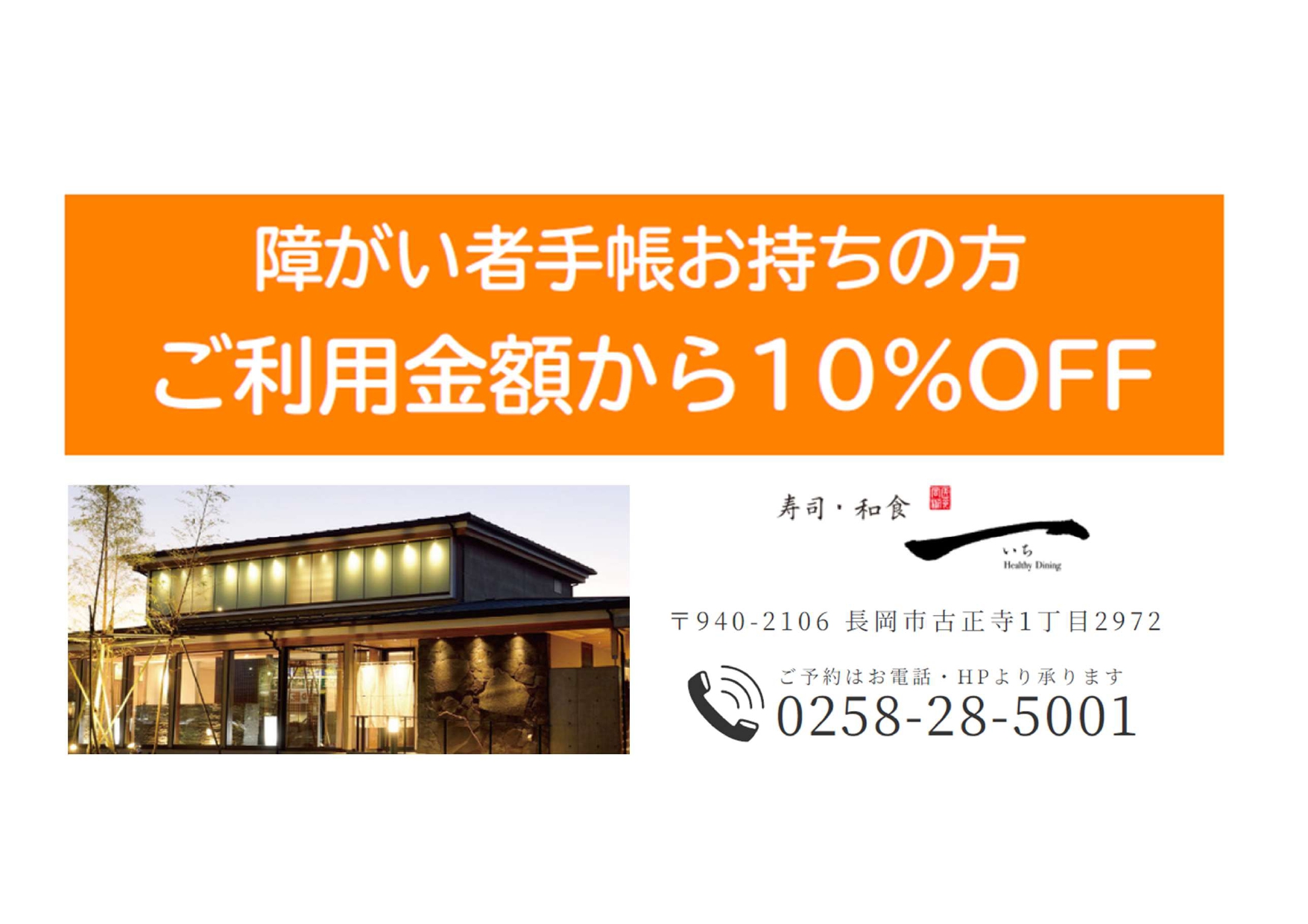 この度、寿司和食一では、11月17日(月曜)から12月31日(水曜)までの期間、「障がい者手帳」をご持参の方を対象に、ご利用料金を割引する取組みを実施いたします。